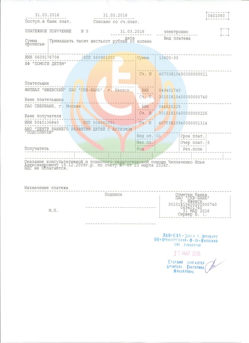 Оплачена реабилитация в клинике "Здоровое Детство" г. Екатеринбург для Челпаченко Ильи