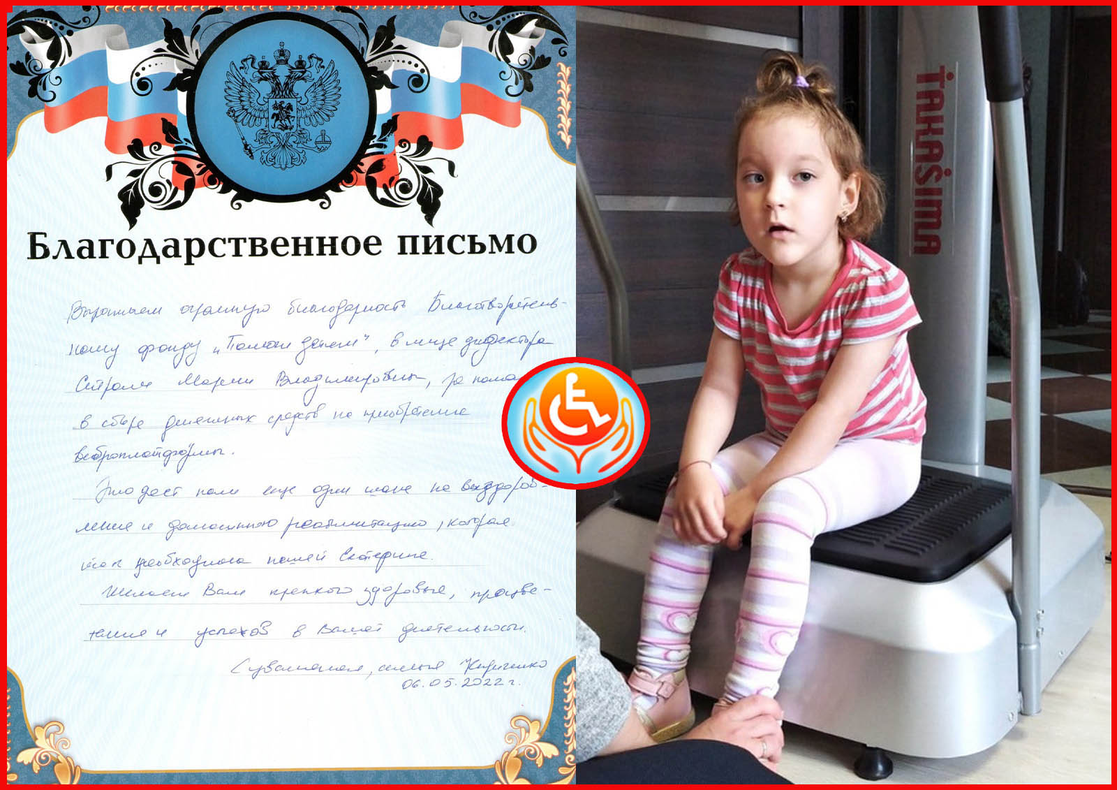 Дорогие наши друзья! Мы снова делимся с вами радостью и благодарим всех Вас, добрые и отзывчивые сердца, за помощь в сборах! Наконец то мы можем сказать о том, что мы оплатили реабилитацию Маше Жадько!!! Так как внешнеполитическая ситуация в стране пока не настолько улучшилась, чтоб мы могли свободно могли заказывать реабилитационную технику зарубежного производства( без 100% предоплаты и полугодового ожидания) , то путем переговоров с родителями Маши было принято решение оплачивать реабилитацию!