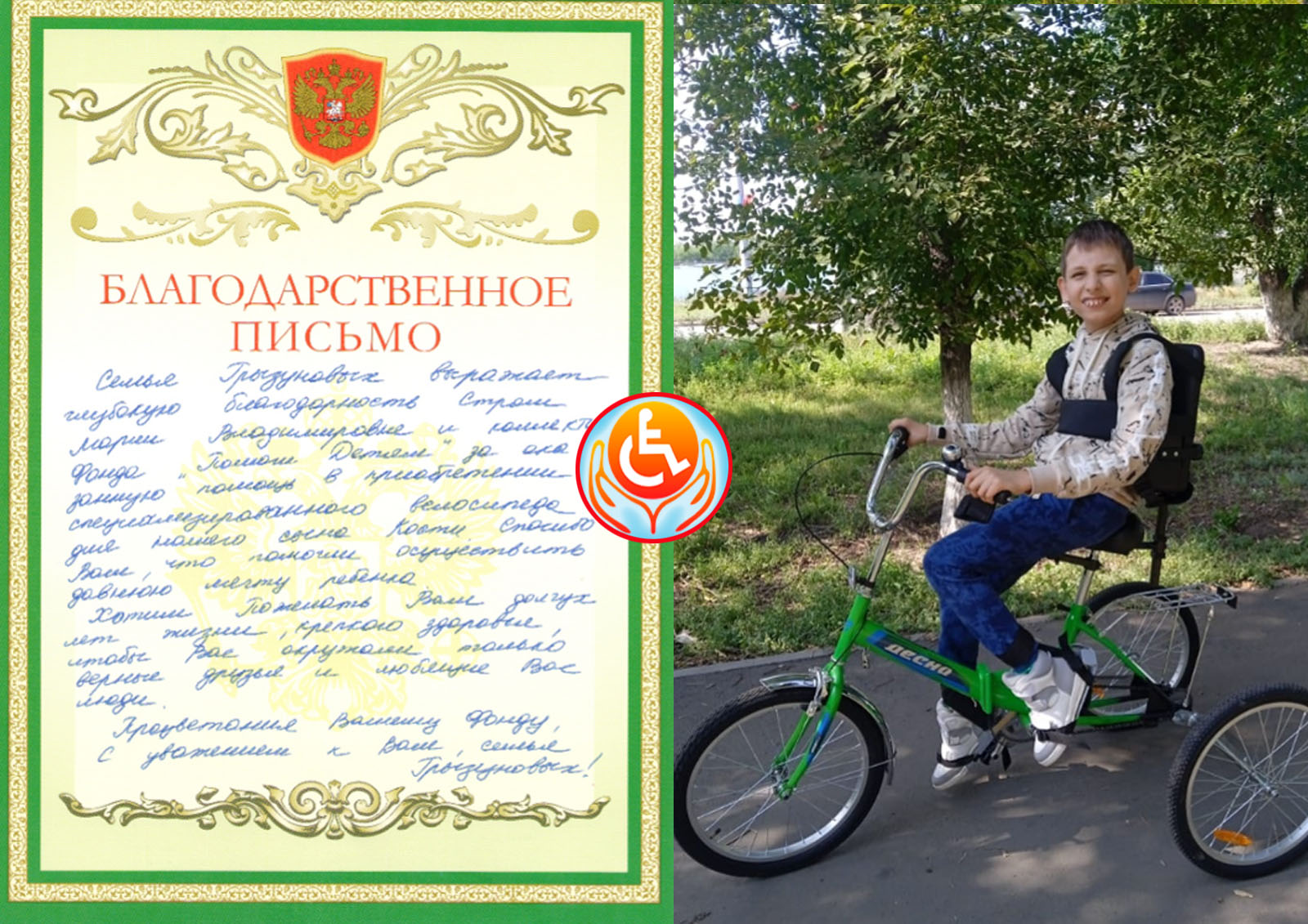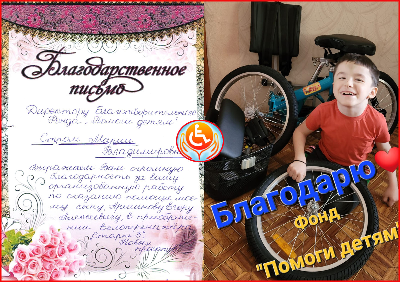 Благодаря Вашей помощи для Игоря приобретен велотренажер "Ангел -Соло" №3(С дополнительными опциями) . Велотренажер поможет Игорю совместить приятные прогулки с занятиями, улучшить координацию движений, укрепить здоровье, улучшить рефлексы, сформировать благоприятный эмоциональный фон, совершенствовать навыки ходьбы!