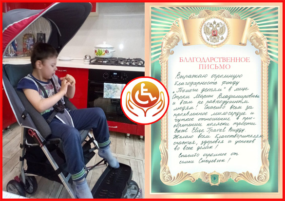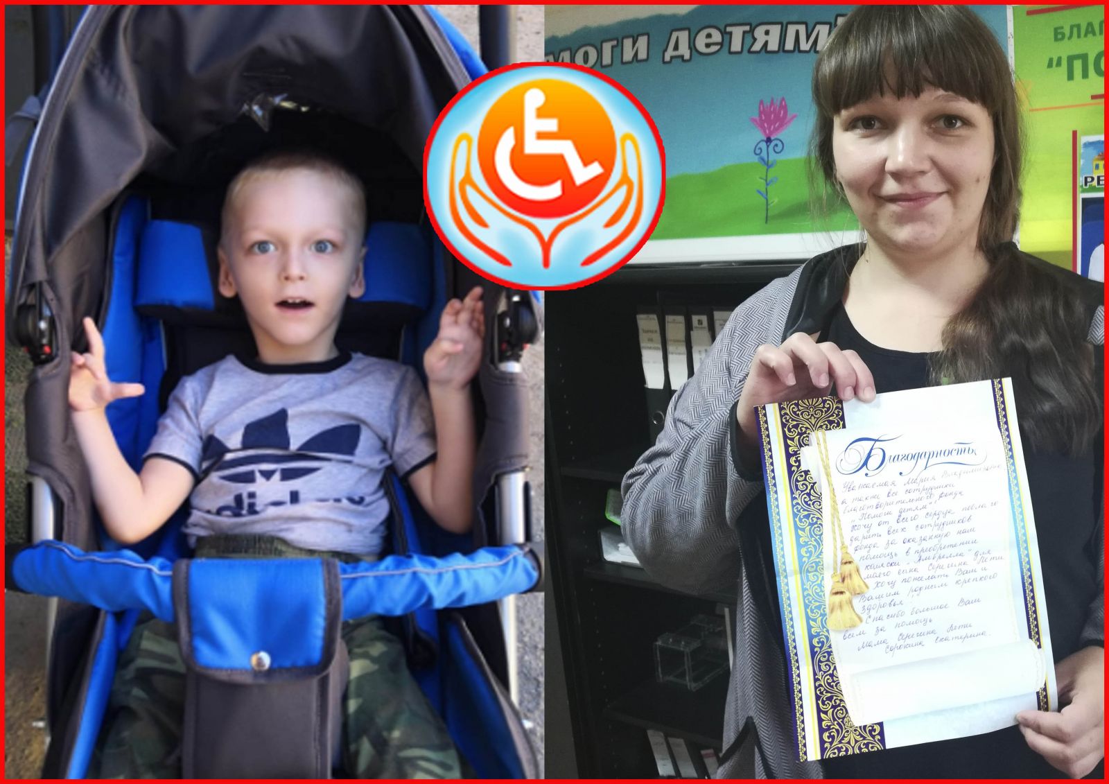 Благотворительным Фондом "ПОМОГИ ДЕТЯМ" была куплена детская, инвалидная кресло-коляска "Эко-Багги" для Ивана Питанова! Теперь мама Ивана сможет возить его на реабилитацию, так как с обычной детской коляски Иван уже вырос, будем надеяться и верить что эта инвалидная коляска будет его первая и последняя!! И Ванечка будет скоро ходить!! Желаем ему здоровья!!