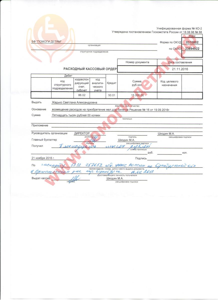 БФ "ПОМОГИ ДЕТЯМ" были оплачены ж/д билеты для поездки на реабилитацию Маши Жадько и ее сопровождающих в оба конца.