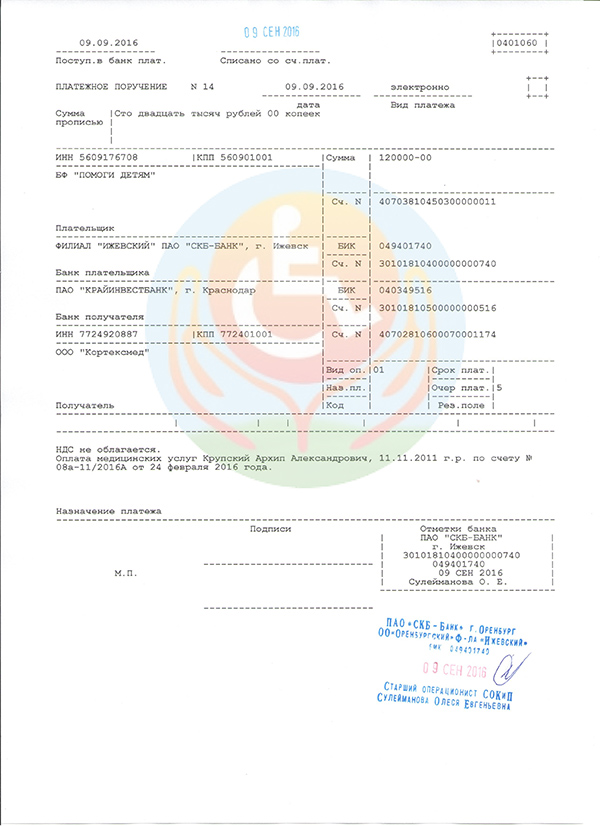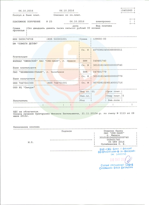 Благотворительным Фондом "ПОМОГИ ДЕТЯМ" была оплачена половина организационного сбора для проведения реабилитационного курса суставной гимнастики для детей с ДЦП ( группа -13 человек). курс проходил в городе Оренбурге с 1 по 10 августа 2017 года